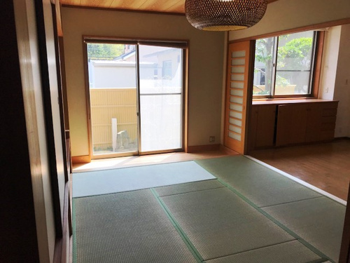 本間の8畳。仏間と床の間があり玄関横のお庭に出る事ができます。